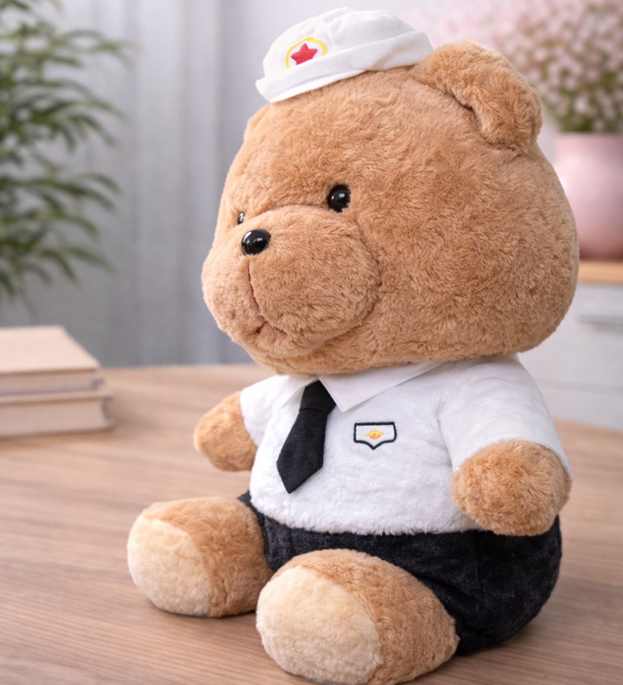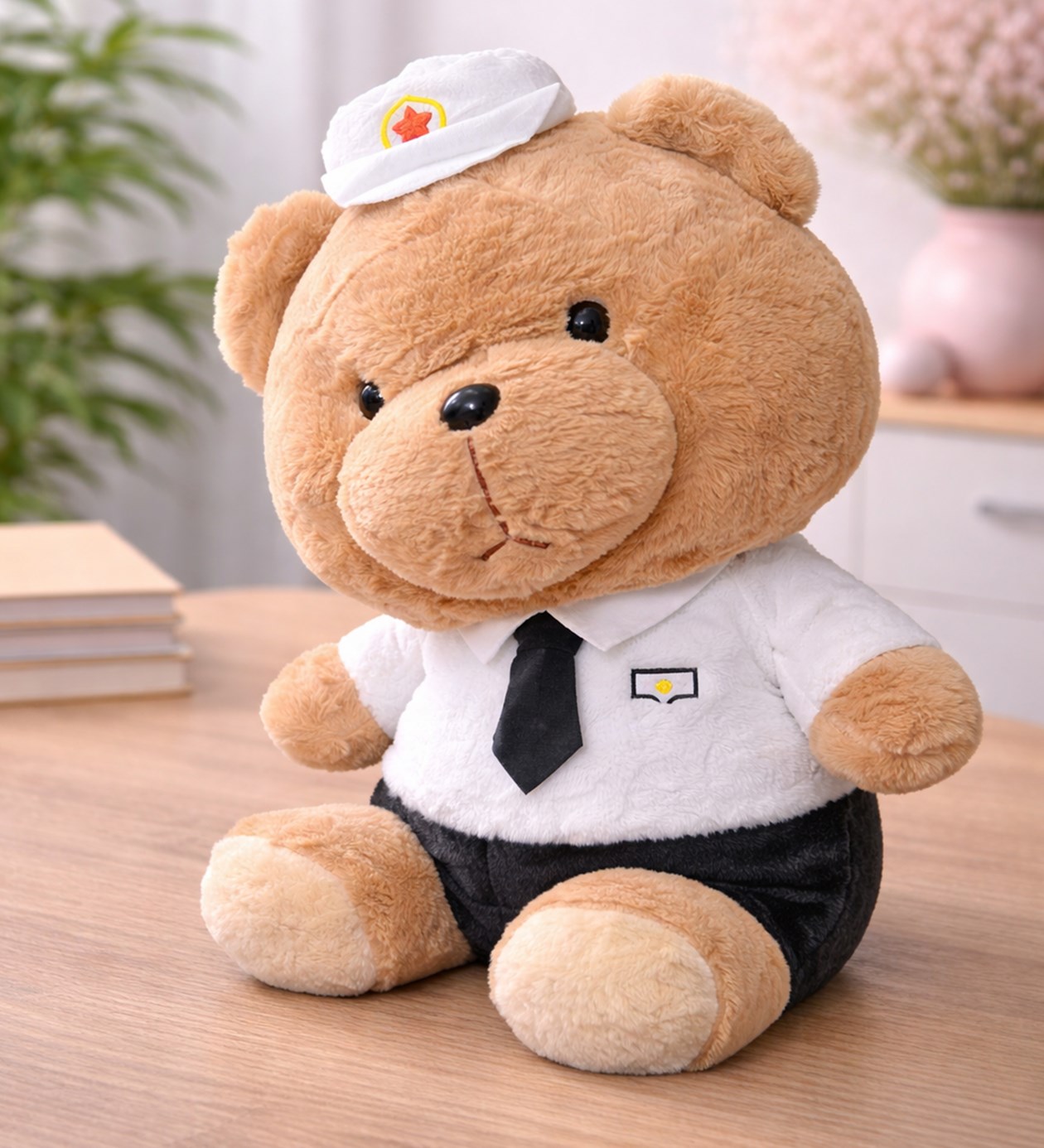 Beyaz gömlek, siyah kravat ve kaptan şapkası detayıyla tasarlanan bu özel peluş ayıcık, mesleki temalı hediyeler arasında farklı ve anlamlı bir seçenek sunar. Yumuşacık peluş kumaşı sayesinde dokunması son derece keyiflidir ve dolgun yapısıyla uzun süre formunu korur.