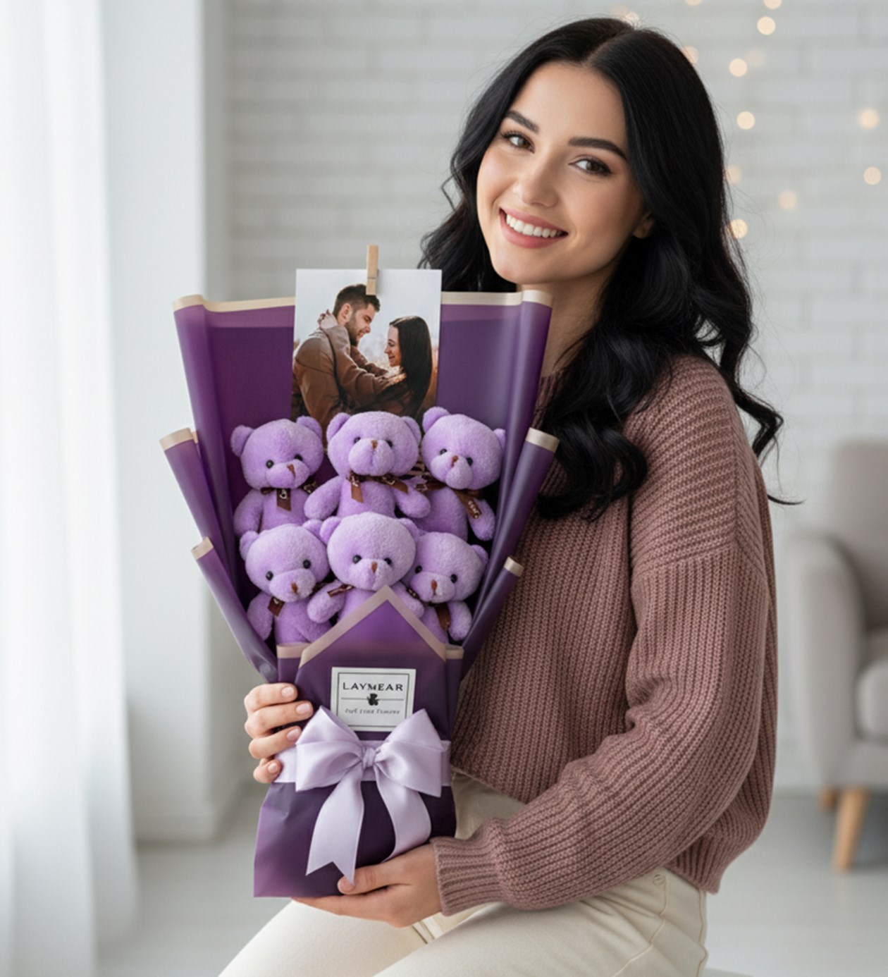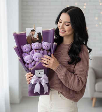Kişiye Özel Fotoğraflı Mor Lila Peluş Ayıcık Buketi