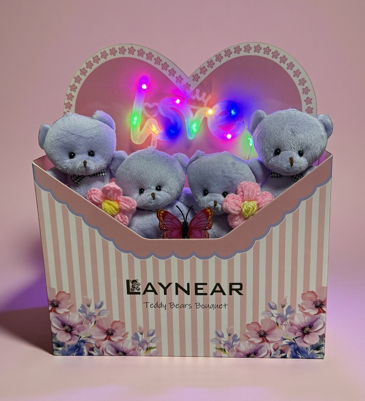 LOVE Ledli Lila Peluş Ayıcık Buketi Kalpli Zarf Tasarım