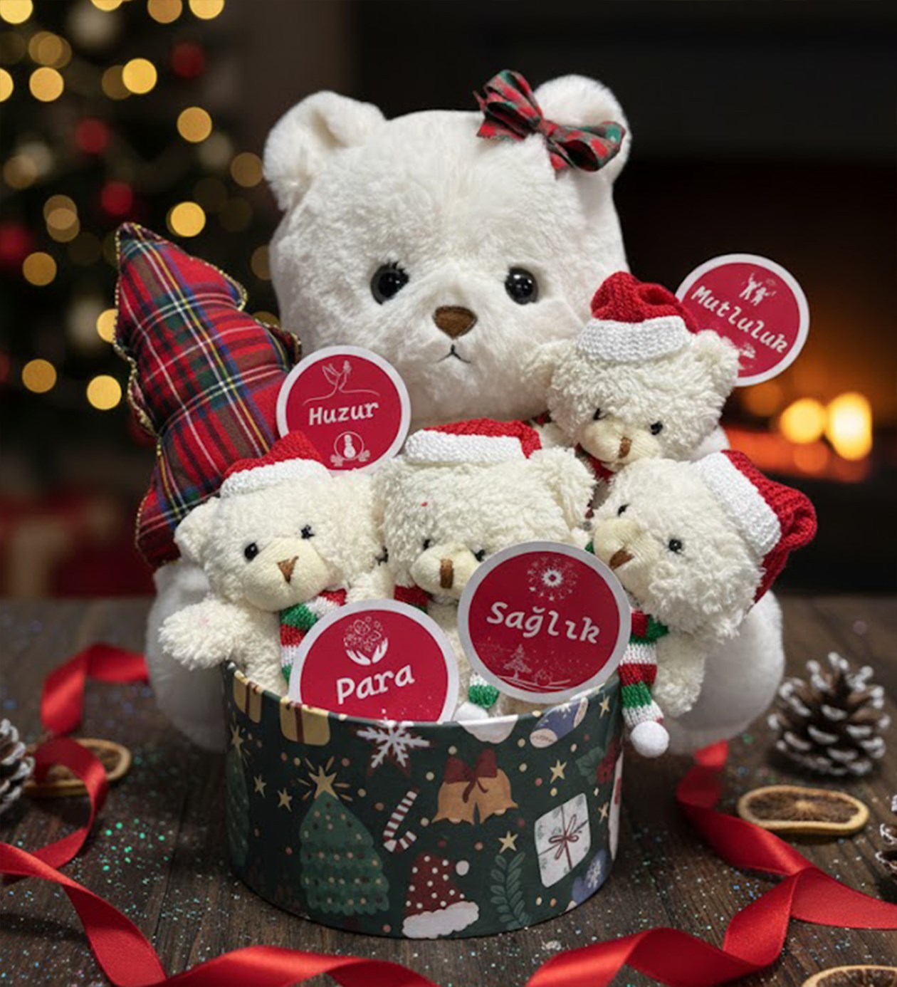 Para,Sağlık,Mutlulu,Huzur Dilekli Noel Yılbaşı Ayıcık Buketi Kucaklayan Sevimli Ayı