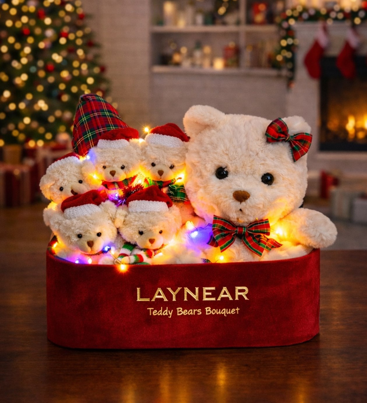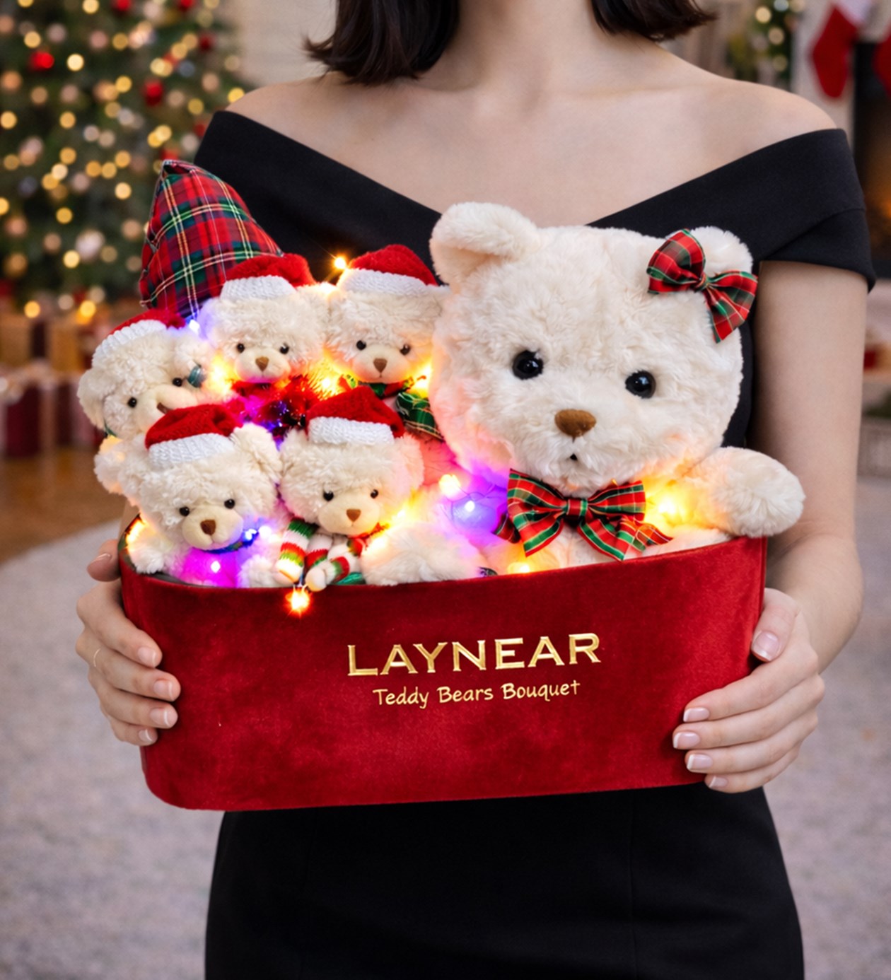 Premium Özel Seri - Noel Yılbaşı Konsept Kırmızı Kadife Kutu da Ayıcık Buketi Sevimli Ayı