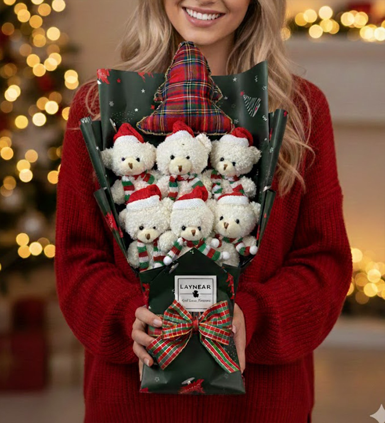 Yılbaşı Konseptli Atkılı ve Şapkalı Sevimli Ayıcıklar Premium Ayı Buketi Chrismas Yastık